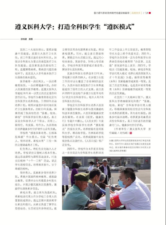 2020年,学校作为4所发言高校之一在全国定向全科医学生培养10周年工作会议上作主旨发言,教育部领导在大会上给予高度肯定;2021年,学校作为全国唯一定向全科医学生培养典型高校在教育部“办实事、见实效”新闻发布会上发言;2023年,学校关于《创建医教、校地、家校全科医学协同育人模式培养扎根西部医学人才十年实践》的成果,获得高等教育(本科)国家级教学成果奖一等奖,实现了历史性突破,也是贵州省高等教育(本科)国家级教学成果奖一等奖的历史性突破。