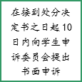 个人权利告知事项:处分决定与本人见面,如有异议,可在接到处分通知起10日内向学校学生申诉处理委员会提出书面申诉。学生申诉处理委员会在接到书面申诉15日内进行复查,做出复查结论并告知申诉人。如对复查决定仍有异议,可在接到复查决定起15日内向省级教育行政部门提出书面申诉。在申诉期间,处分决定有效。