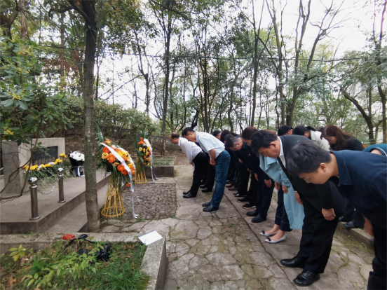 在大连路校区后山,全体人员一起向陈荣殿教授、伍律教授深深三鞠躬,默哀致意,向两位先贤敬献花篮,并仔细整理花篮挽联,以表达对陈荣殿教授、伍律教授崇高的敬意和缅怀追思之情。