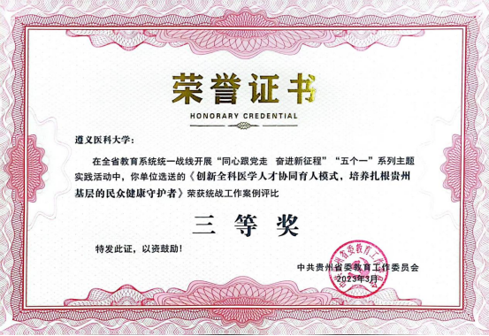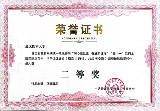 近日,省委教育工委印发《省委教育工委关于表彰“同心跟党走 奋进新征程”“五个一”系列主题实践活动成果的通知》,beat365荣获多项表彰。其中,统战知识竞赛荣获一等奖,统战视频作品《遵医山海情 共绘同心圆》荣获二等奖,统战工作案例《创新全科医学人才协同育人模式 培养扎根贵州基层》荣获三等奖。