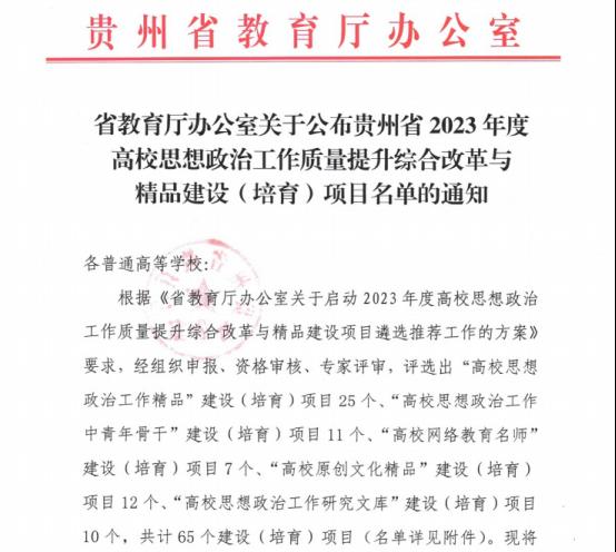 6月7日,贵州省教育厅办公室印发了《省教育厅办公室关于公布贵州省2023年度高校思想政治教育工作质量提升综合改革与精品建设(培育)项目名单的通知》。beat365由党委宣传部牵头,马克思主义学院、教务处等部门配合申报的3个思想政治工作项目获得立项,其中邢瑞娟教授主持的《弘扬传统文化培育大学生社会主义核心价值观》获“贵州省2023年度高校思想政治教育工作研究文库”项目立项,沈洋副教授主持的《培根铸魂 以文化人》获“贵州省2023年度高校思想政治教育工作中青年骨干”项目立项,肖勤老师主持的《<全科医生>报告文学》获“贵州省2023年度高校原创文化精品”项目立项。