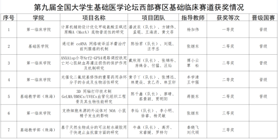 本届大赛自3月启动以来,学校领导高度重视,教务处认真组织,珠海校区、各学院积极动员,共组建了46个项目团队160余名在校生参加校级比赛的遴选,最终选拔出8个项目团队代表学校参加本科院校基础临床赛道西部赛区复赛。