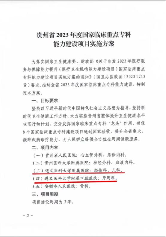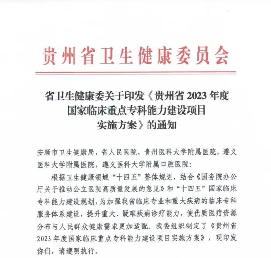 9月12日,贵州省卫生健康委下发了《贵州省2023年度国家临床重点专科能力建设项目实施方案》,beat365在线唯一官网附属医院烧伤科、儿科,beat365在线唯一官网附属口腔医院牙周科相继成功通过“国考”,获批为2023年国家临床重点专科建设项目。