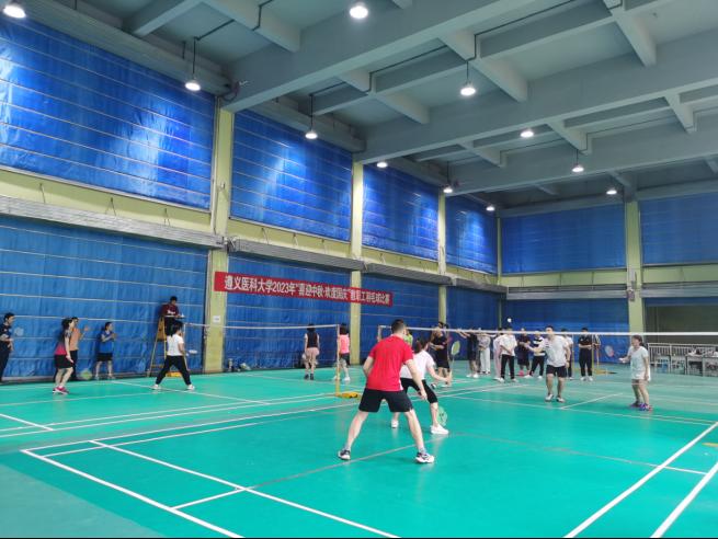 全校各二级工会组成的十二支队伍参赛。本次比赛采用团体赛方式进行,按男单、女单、混双、女双、男双顺序进行。赛场上,各参赛队精心布阵,参赛选手使出浑身解数,高远球、扣杀、吊球等各路球技展现得淋漓尽致,使比赛悬念迭起、精彩纷呈。每打完一场,参赛选手都微笑握手,充分展现了全员健身、重在参与的运动氛围,展示了遵医人朝气蓬勃、昂扬向上的精神风貌和敢于进取的拼搏精神。