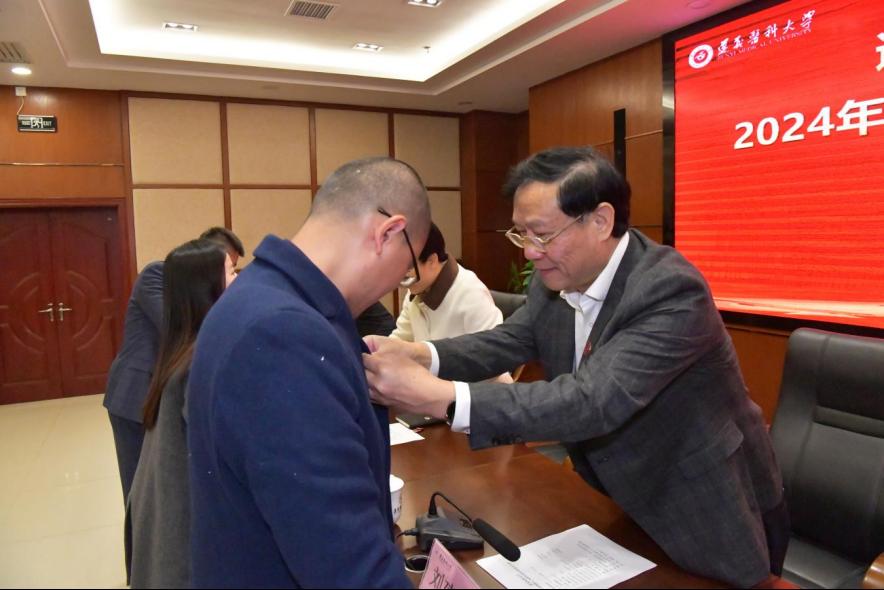 开班仪式上,校领导为2024年新进教职工代表佩戴校徽。刘建国带领新教师入职宣誓,全体参会人员用整齐洪亮的誓言表达了忠诚党的教育事业,做“四有”好教师的决心。