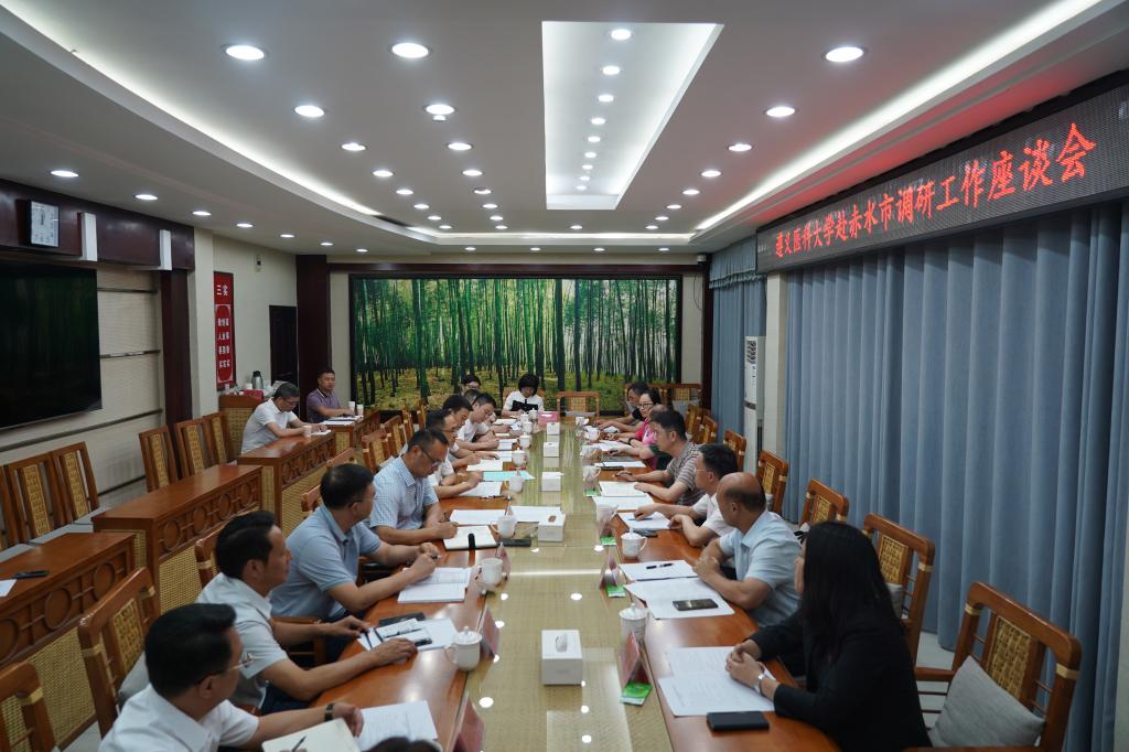 7月14日,学校党委书记刘文率队到赤水市开展校地合作调研。遵义市人大常委会副主任、赤水市委书记汪能科,赤水市委常委、常务副市长王远,副市长袁贵平及学校科技处、附属医院和相关学院负责同志,赤水市相关单位负责人参加座谈。