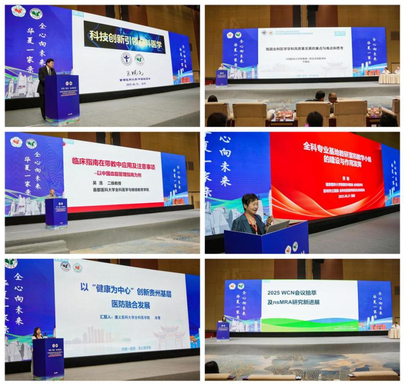 大会报告中,专家们聚焦学科前沿与挑战进行了精彩纷呈的分享。王晓民教授阐述《科技创新引领全科医学》,指出数字化、智能化是推动服务模式变革与质量提升的关键。于晓松教授在《我国全科医学学科高质量发展重点与难点和思考》中,系统梳理发展任务与难题,提出针对性解决思路。吴浩教授以血脂管理指南为例,详解《临床指南在带教中运用注意事项》,体现以人为本的教学理念。黄敏教授探讨《全科教研室作用发挥》,为优秀人才培养指明方向。肖雪教授分享《以“健康为中心”创新贵州基层医院融合发展》的实践经验。郑涓教授带来《2025VCX会议培养及m-MRA研究新进展》,传递国际学术动态。大会还设全科科技与科研能力提升、全科医生能力提升、慢病专病管理三个分论坛。全国顶尖专家学者进行多维聚焦,展开了深度交流。