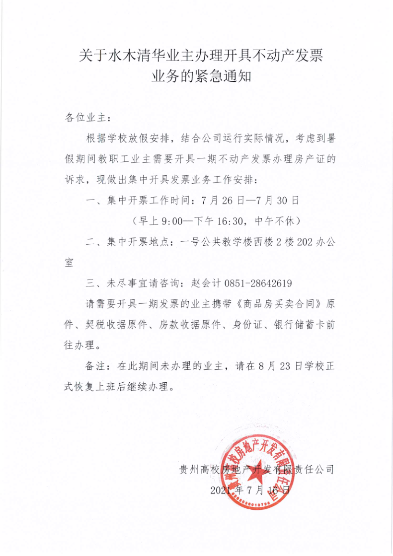 根据学校放假安排,结合公司运行实际情况,考虑到暑假期间教职工业主需要开具一期不动产发票办理房产证的诉求,现做出集中开具发票业务工作安排: