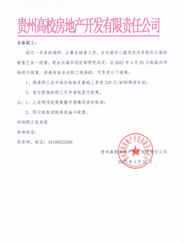 经过一年多的调研、认筹及销售工作,水木清华二期项目对系统内大面积销售已告一段落,现水木清华项目部研究决定:自2022年4月25日起面向市场进行销售,若再有体系内职工购房的,可享受以下政策: