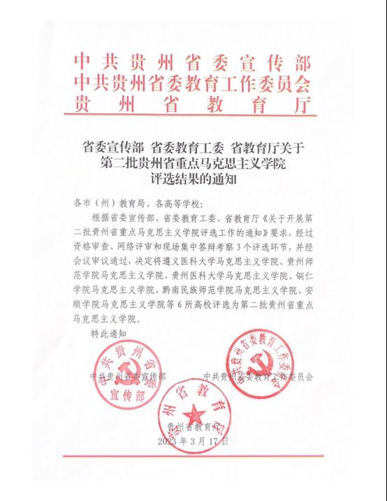 日前,根据《省委宣传部省委教育工委省教育厅关于第二批贵州省重点马克思主义学院评选结果的通知》,beat365马克思主义学院获评第二批贵州省重点马克思主义学院。据悉,本次评选工作自2022年8月启动,经过资格审查、网络评审和现场集中答辩考察3个评选环节,最终遴选出6所高校马克思主义学院为第二批贵州省重点马克思主义学院,beat365马克思主义学院以较好成绩获评。