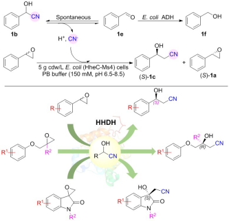 手性β-羟基腈是一类重要的腈类化合物。卤醇脱卤酶可以通过催化环氧化物区域选择性和立体选择性氰化反应制备手性β-羟基腈化合物,是一种非常重要的生物催化氰化策略,该策略已被用于降血脂药物阿托伐他汀的绿色生物制造工业生产。然而,与大多数化学氰化反应工艺类似,该反应需要以剧毒的氰化钠(NaOCN)或氢氰酸(HCN)作为氰源,具有极大的安全隐患,尤其限制了该技术在实验室的研究。