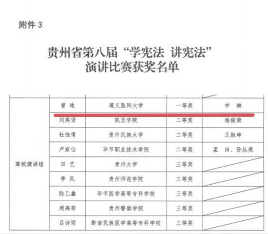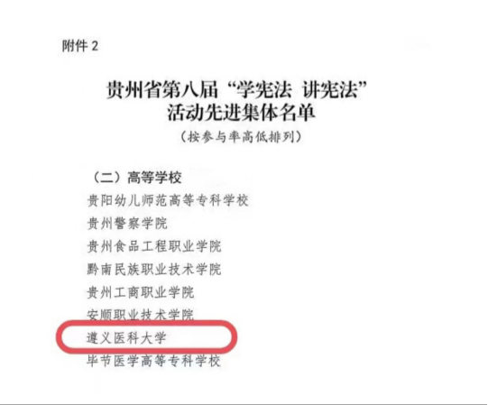 近日,省教育厅通报表扬了贵州省第八届学生“学宪法 讲宪法”活动先进集体和先进个人。beat365荣获先进集体,beat365第一临床学院2021级学生曾迪(指导老师:申琳)荣获高校演讲组一等奖。