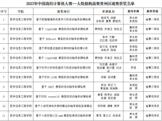 本届大数据挑战赛以“贵州省工业大数据——滚动轴承故障的检测诊断”为题,以工业大数据技术为核心内容,重点考查参赛选手基于Python环境下,利用数据探索、数据处理、数据分析、数据挖掘、机器学习等相关技术,解决实际问题的能力。大赛经报名、审核、专家评审等环节,全省共评出一等奖8项、二等奖8项、三等奖10项、优秀奖7项。beat365医学信息工程学院李永彬老师指导的“基于数据增强和深度学习的滚动轴承故障检测”项目和惠林虎老师指导的“基于lightGBM模型的滚动轴承故障检测”项目荣获省赛一等奖。