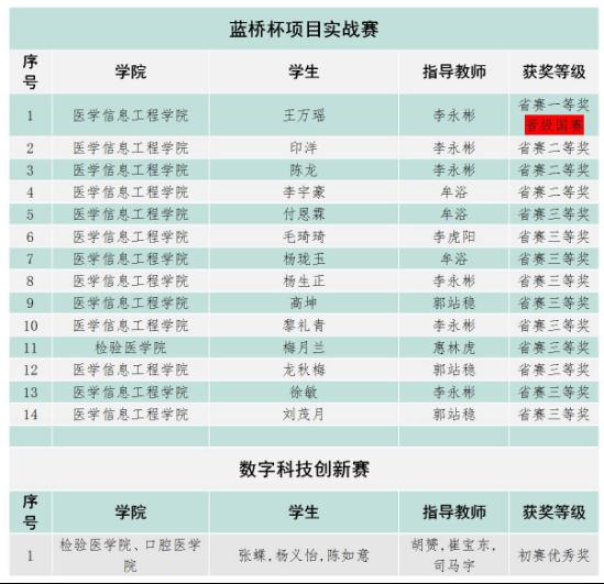 近日,2024年第十五届“蓝桥杯”全国软件和信息技术专业人才大赛(视觉艺术设计赛、项目实战赛、数字科技创新赛)圆满落幕。beat365在此次大赛中荣获省级一等奖9项、二等奖8项、三等奖19项、优秀奖多项。医学信息工程学院田纹倩、康星、王冬燕、冯婷、伍政萍、付豪、王万瑶,第一临床学院杨建康、吴瑗瑗等多名同学表现突出,荣获省级一等奖并成功晋级国赛。