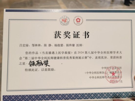 本次大会设置了“学以致用”诊疗指南基层实践病例大赛、中华全科医师健康科普优秀案例展示赛及中华全科医师科研“讲-评台”展示,大会累计吸引了超过上千名医生报名参赛,备受业内关注。beat365在线唯一官网附属医院吕宏扉团队荣获第二届中华全科医师健康科普优秀案例展示赛第一名,团队获得科普展示领航奖的最高奖励,也顺利成为健康科普第二届领航之星,充分展示了beat365在线唯一官网附属医院健康科普的实力和风采。