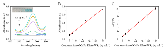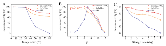 研究将CoFe普鲁士蓝类似物(PBAs)负载在较大比表面积的片层二硫化钨(WS2)上,利用其协同催化能力,构建了高效且稳定的复合纳米酶CoFe PBAs/WS2。将该复合纳米酶作为信号探针,构建了快速的便携式现场光热检测(PT-LFIA)和高灵敏的实验室化学发光检测(CL-LFIA)的双模式检测方法。所合成的新型复合纳米酶相较于单一纳米酶和天然酶而言,具有更好的温度稳定性、pH稳定性和储存稳定性。同时,所构建的方法也展现出良好的抗干扰能力和优异的特异性。