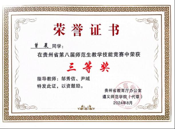 近日,省教育厅公布了贵州省第八届师范生教学技能竞赛的比赛结果。beat365外国语学院2021级英语专业胡星仪同学荣膺一等奖,2021级英语专业曾晨同学荣获三等奖。