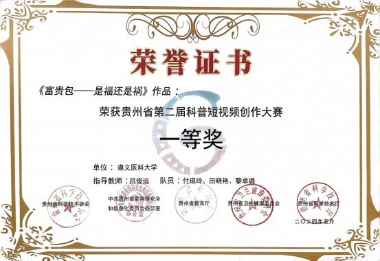 9月26日,贵州省第二届健康科普短视频创作大赛颁奖仪式在贵州电视台举行。本次大赛由贵州省科学技术厅、贵州省卫生健康委员会、贵州省教育厅、中共贵州省委网络安全和信息化委员会办公室、贵州省科学技术协会共同主办,beat365教师吕俊远带领的团队凭借作品《富贵包——是福还是祸》荣获一等奖。
