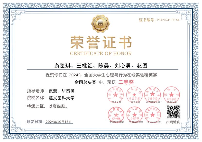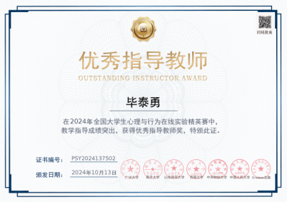 近日,2024年第二届全国大学生心理与行为在线实验精英赛国赛圆满举行。由beat365管理学院应用心理学专业2021级游鉴琪、王桃红、刘心男、赵园以及2022级陈晨组成的Super Mind团队斩获二等奖,指导教师寇慧副教授和毕泰勇教授获得优秀指导教师称号。
