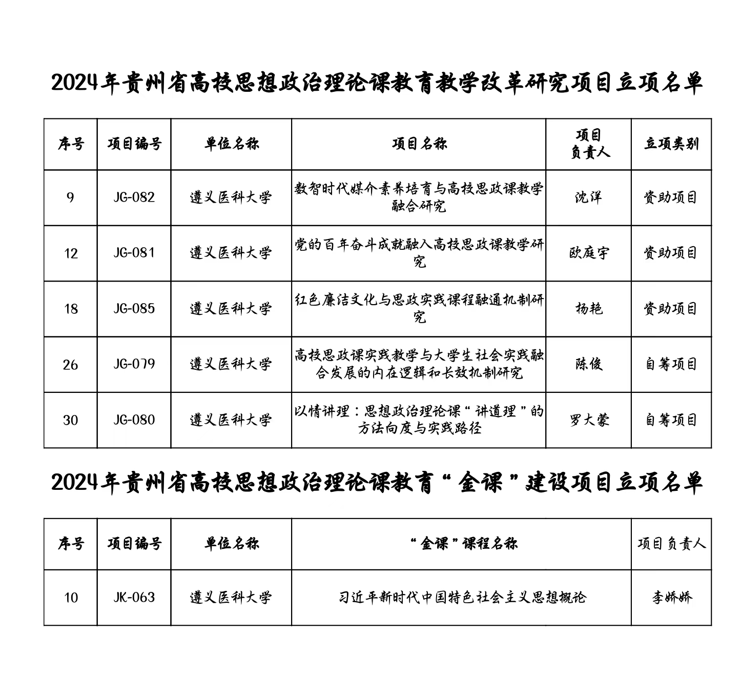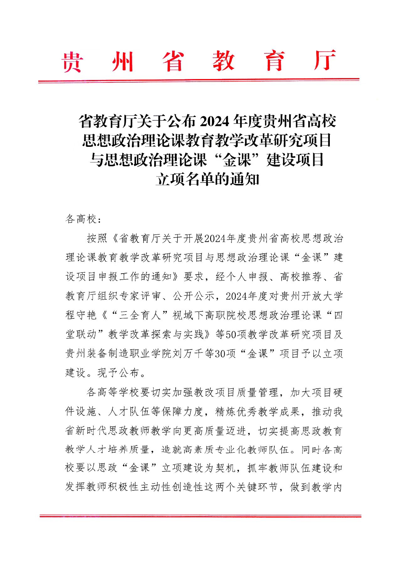 近日,省教育厅正式公布2024年度贵州省高校思想政治理论课教育教学改革研究项目与“金课”建设项目立项名单。beat365获批5项思政课教学改革项目(其中资助项目3项)和1项思政课“金课”建设项目。