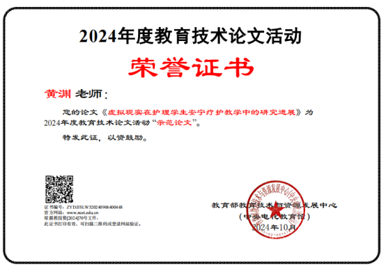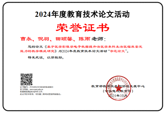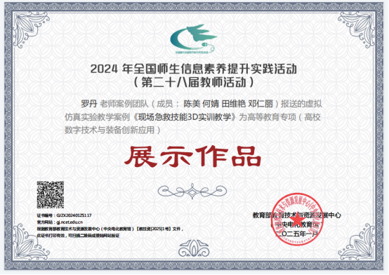 2024年全国师生信息素养提升实践活动分三个项目进行,分别是常规项目(含课件、微课、信息化教学课程案例三个项目)、高等教育专项(虚拟仿真实验教学案例)、教育技术论文专项。此次beat365入选作品分别是罗毅的课件《实验室安全教育仿真教学》,姚培学的微课《抗利尿激素—水闸指挥官》,王连红团队的信息化教学课程案例《助产学》,罗丹团队的虚拟仿真案例《现场急救技能3D实训教学》,曹永团队的论文《基于医学影像学电子数据提升法医学本科生法医临床鉴定能力的教学模式研究》,黄渊的论文《 虚拟现实在护理学生安宁疗护教学中的研究进展》。