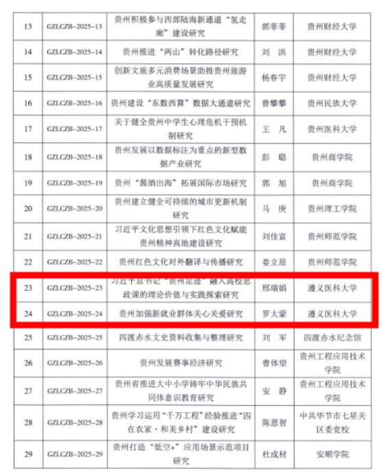 在本次立项的31项贵州省理论创新课题(招标课题)中,beat365共有2项课题成功入选。其中,邢瑞娟教授主持的《习近平总书记“贵州足迹”融入高校思政课的理论价值与实践探索研究》,立足贵州红色文化资源,探索将领袖地方实践转化为高校思政课育人素材的有效路径,具有重要的理论意义和实践价值。罗大蒙博士主持的《贵州加强新就业群体关心关爱研究》,聚焦新业态下的社会治理新课题,为促进新就业群体融入城市发展提供智力支持。