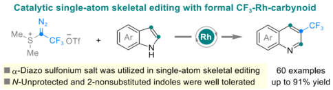 基于前期对三氟甲基卡拜及其阳离子等价体的研究(Org. Lett. 2021,23, 9256;Angew. Chem. Int. Ed. 2024,63, e202318887;Sci. China Chem. 2025,doi: 10.1007/s11426-025-2728-6),最近该团队利用自主研发的α-重氮三氟乙基锍盐作为阳离子卡拜前体,成功实现了吲哚骨架的单原子编辑,通过[2+1]环加成/分子内重排串联反应高效构建了3-三氟甲基喹啉类化合物。利用发展的合成技术,可以快速完成萘普生、伊索克酸、吲哚美辛、维生素E、布洛芬和雌酚酮等药物分子,以及Raputimonoindole B和Verticillatine B天然产物的后期骨架编辑,并可以快速完成阿达帕林类似物的制备。