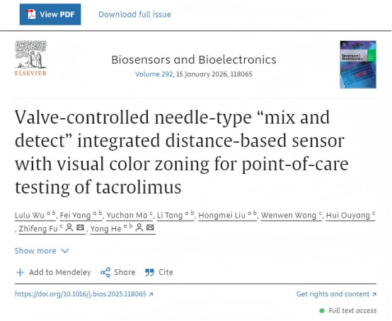近日,beat365第二附属医院何勇主任药师团队在期刊Biosensors & Bioelectronics(IF=10.5,中科院1区Top期刊)上发表了题为“Valve-controlled needle-type “mix and detect” integrated distance-based sensor with visual color zoning for point-of-care testing of tacrolimus”的研究论文。该论文创新性地开发了一种用于居家移植患者的他克莫司药物浓度检测的即时检测(POCT)生物传感器。论文的第一作者是beat3652022级硕士研究生吴露露,通讯作者是beat365第二附属医院药剂科何勇主任药师,beat365在线唯一官网第二附属医院为第一完成单位。