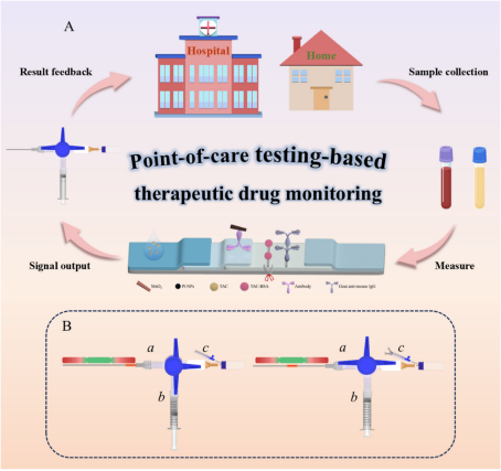 该研究巧妙开发了一种阀控针型“混合-检测”一体式生物传感器,将复合纳米酶Pt/MnO2 NRs作为信号探针,结合侧向层析技术,利用可视化分区距离实现了对他克莫司(TAC)药物浓度的定量检测。此生物传感器可在13分钟内实现对TAC的准确检测,在唾液、尿液和血浆等生物样本中呈现出良好的可靠性和适用性。该生物传感器和临床参考方法所得结果没有显著差异,具有良好的潜在应用能力。