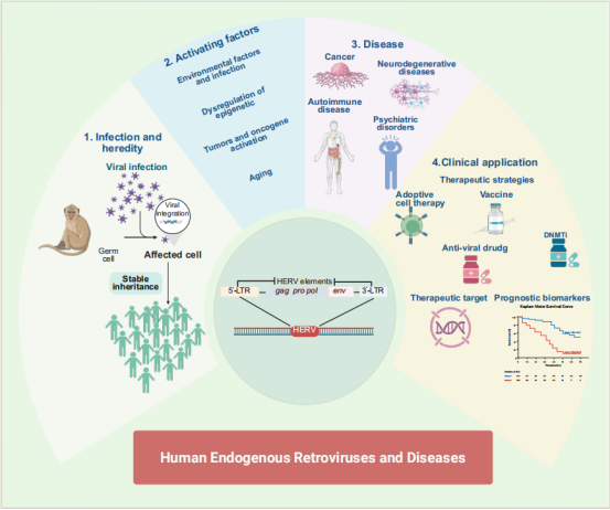 HERVs是古代逆转录病毒感染生殖细胞后整合到人类基因组的遗迹,占人类基因组的近8%,曾被视为无功能的 “基因组化石”。最新研究证实,这些元件通过表观遗传调控、分子模拟等机制,在生理调节和疾病发生中发挥双重作用。其结构中的长末端重复序列(LTRs)可作为启动子或增强子调控邻近基因表达,部分年轻亚家族(如HERVK、HERVW)仍保留完整开放阅读框,能在特定条件下产生功能蛋白和类病毒颗粒。在癌症中,HERVs异常激活可通过激活癌信号通路、诱发基因组不稳定性、调控肿瘤免疫微环境等促进肿瘤发生发展,同时其衍生抗原可作为肿瘤特异性靶点;在多发性硬化症、系统性红斑狼疮等自身免疫性疾病中,HERVs核酸和蛋白可激活先天免疫通路,引发异常炎症反应;在肌萎缩侧索硬化症、阿尔茨海默病等神经退行性疾病中,HERVs再激活与蛋白聚集、神经元损伤密切相关。该研究梳理了当前HERVs靶向治疗的前沿策略,包括表观遗传调节剂、单克隆抗体、CAR-T细胞疗法、基因编辑等,并梳理了多项正在开展的临床研究进展。例如,针对HERVW包膜蛋白的单克隆抗体在多发性硬化症临床试验中显示出神经保护潜力,逆转录酶抑制剂在遗传性自身炎症综合征治疗中已取得初步疗效,为疾病治疗提供了新的临床方向。