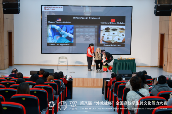 beat365“Miao-tivators” 代表队由23 级临床医学专业胡湘婷、陈浩聪和23 级英语专业郑睿三位同学组成。在全国决赛的舞台上,赛事涵盖案例开发与分析、名言名句解读、知识问答等多个核心环节,考察维度全面且极具挑战性。三位同学延续省赛优势,巧妙融合医学专业知识与跨文化交际理论,以“苗寨医疗场景中的跨文化融合” 为核心展示方向,通过流利的英语表达、严谨的逻辑论证、真挚的情感传递和自信沉稳的现场应变,生动诠释了传统中医与现代西医在跨文化语境下的碰撞与共生,展现了当代医学生兼具家国情怀与全球视野的复合型人才素养,赢得了评委们的高度认可。