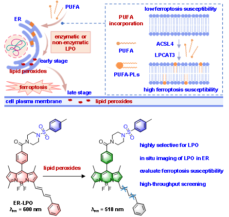 评估细胞对铁死亡的敏感性(由脂质过氧化LPO驱动的程序性细胞死亡过程),对于理解相关疾病发病机制及开发靶向治疗策略至关重要。beat365袁泽利教授课题组与中国科学院化学所马会民研究员课题组合作,依据内质网(ER)是铁死亡过程中LPO最早积累的位点,提出了通过监测ER中的LPO新策略。该策略创建了一个靶向ER的荧光探针ER-LPO,探索其监测ER内的LPO过程,并评估细胞铁死亡敏感性及中药材中抗铁死亡有效成分的筛选。该研究表明:ER-LPO对LPO表现出快速、灵敏且选择性的荧光响应,并可通过ER-LPO成像技术,监控铁死亡过程中ER膜上LPO的动态积累,该过程与细胞存活率下降密切相关,但与铁死亡诱导途径和细胞系无关。研究中还发现,通过补充多不饱和脂肪酸(PUFA)或增强ACSL4催化的PUFA同化作用以增加膜磷脂中的PUFA含量,可加速LPO进程并提高细胞对铁死亡的敏感性;相反,补充单不饱和脂肪酸或抑制ACSL4以阻断PUFA摄取,则能降低LPO水平并增强细胞的铁死亡抗性。该研究将进一步用于天然药材中抗铁死亡有效成分的高通量筛选,鉴定出黄芩素(一种三羟基黄酮衍生物)可作为高效的铁死亡抑制剂,这可能是由于其自身的抗氧化能力和脂氧合酶抑制活性。