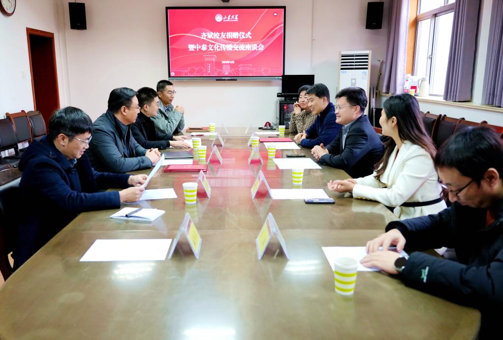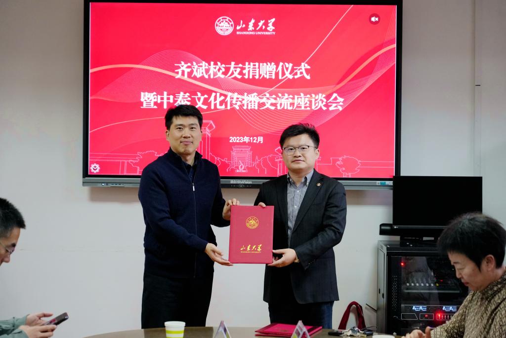 本站讯 近日,齐斌校友捐赠仪式暨中泰文化传播交流座谈会在beat365在线唯一官网登录举行。泰国格乐大学副校长、山东大学泰国校友会副会长兼秘书长、致公党山东省委海联委副主任齐斌,校区校地合作与校友工作办公室主任顾炜、beat365在线唯一官网登录党委书记魏斌出席活动。