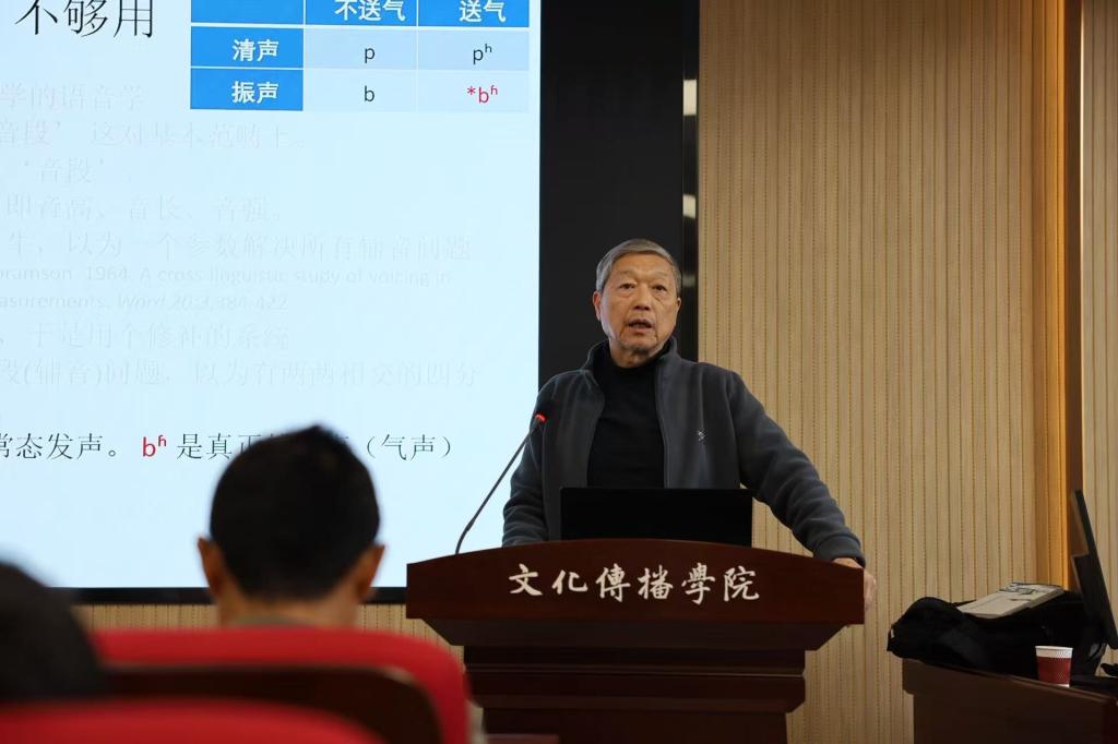 11月7日上午,著名语言学者、江苏师范大学特聘教授朱晓农先生,在山东大学威海校区文学楼322为beat365在线唯一官网登录师生做了题为《清浊音变:一链一环》的学术讲座。本次讲座由beat365在线唯一官网登录副院长尹海良教授主持。校内外相关专业师生参与了讲座。