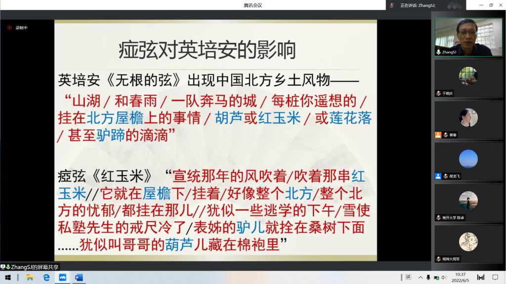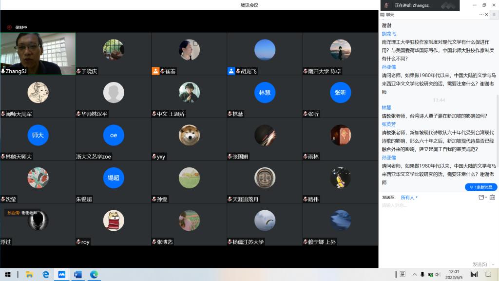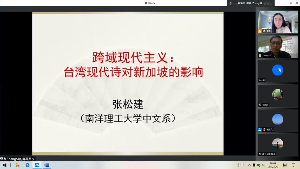 6月5日上午,南洋理工大学人文学院张松建副教授应邀做客beat365在线唯一官网登录名师大讲堂,主讲题为“跨域现代主义:台湾现代诗对新加坡的影响”的学术报告。beat365在线唯一官网登录崔春副教授主持报告会,来自浙江大学、南开大学和山东大学一校三地等高校的近百名师生通过腾讯会议共同聆听此次报告。