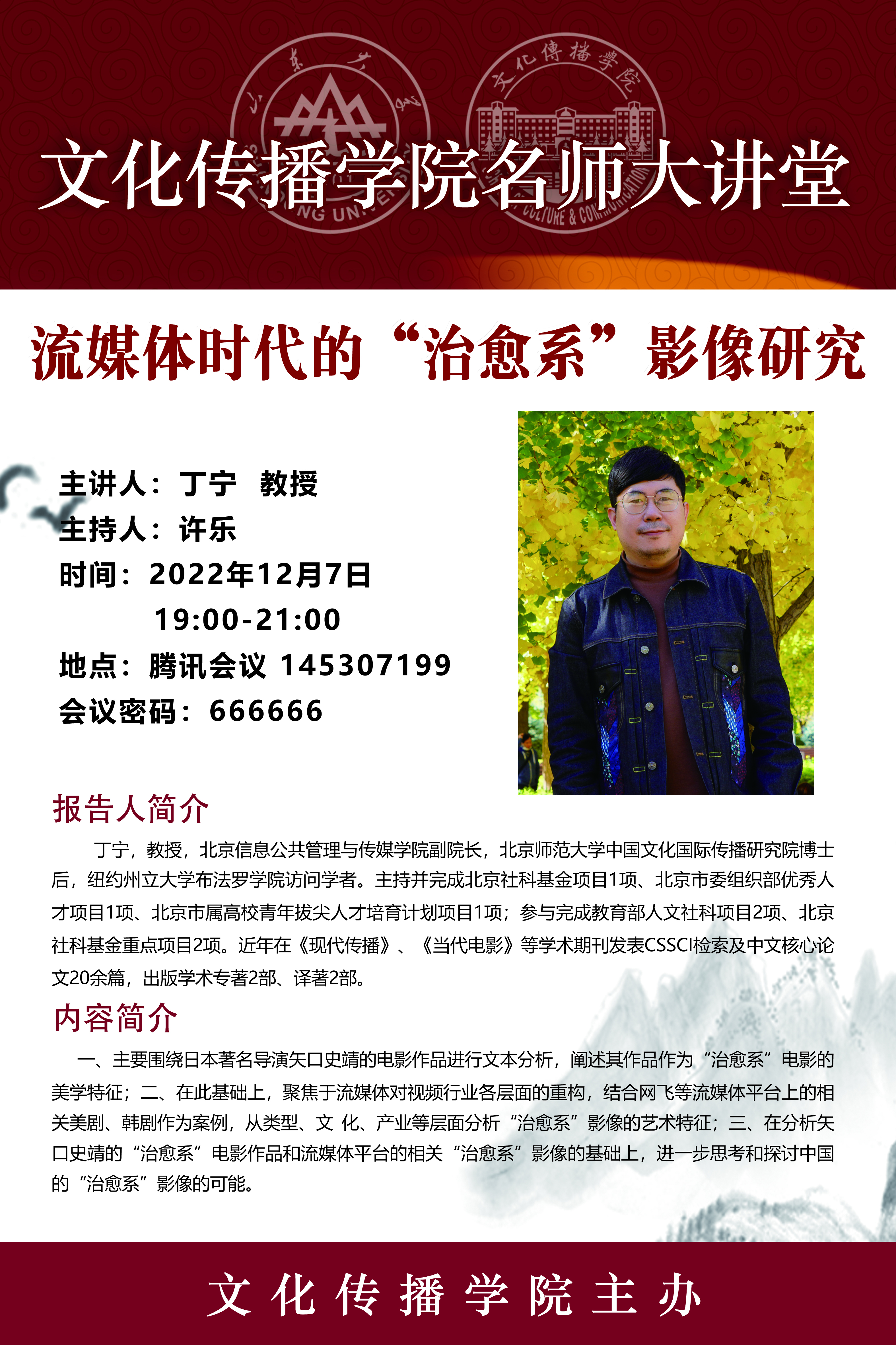 丁宁,教授,北京信息公共管理与传媒学院副院长,北京师范大学中国文化国际传播研究院博士后,纽约州立大学布法罗学院访问学者。主持并完成北京社科基金项目1项、北京市委组织部优秀人才项目1项、北京市属高校青年拔尖人才培育计划项目1项;参与完成教育部人文社科项目2项、北京社科基金重点项目2项。近年在《现代传播》、《当代电影》等学术期刊发表CSSCI检索及中文核心论文20余篇,出版学术专著2部、译著2部。
