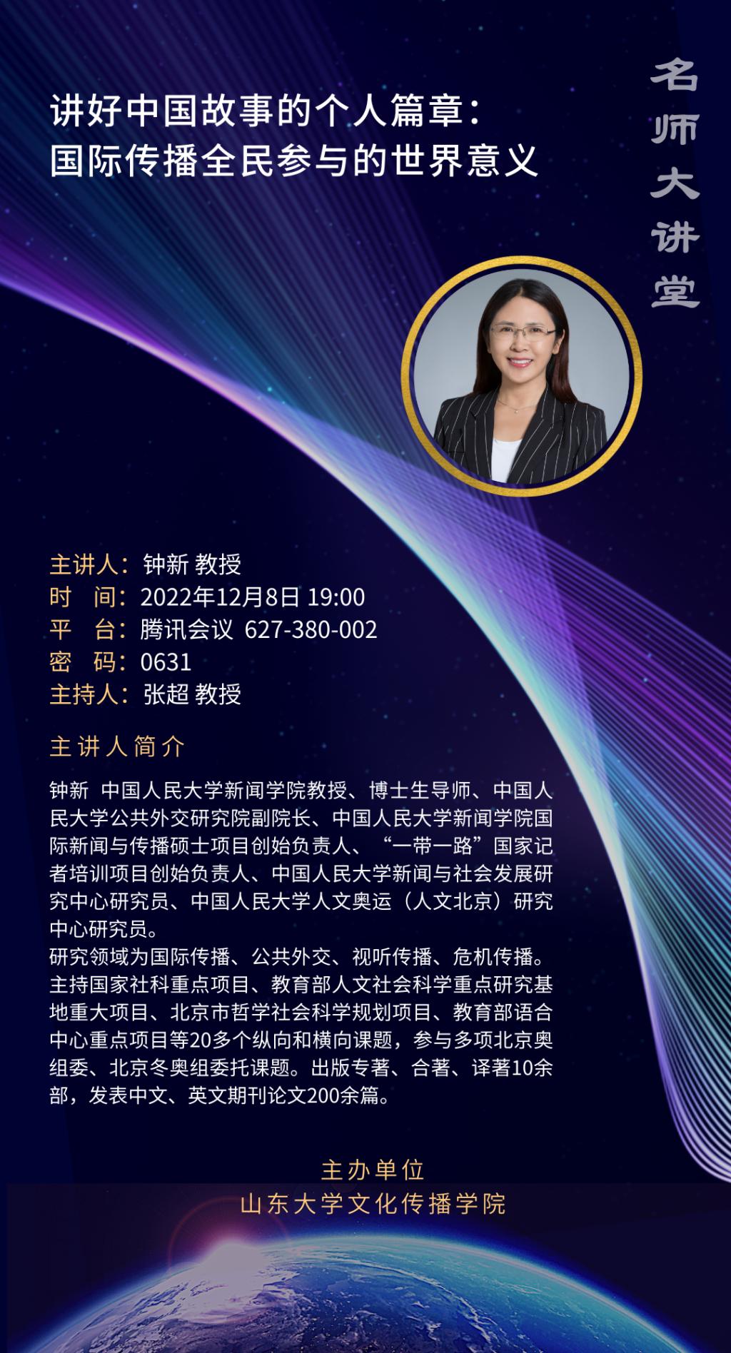 钟新 中国人民大学新闻学院教授、博士生导师、中国人民大学公共外交研究院副院长、中国人民大学新闻学院国际新闻与传播硕士项目创始负责人、“一带一路”国家记者培训项目创始负责人、中国人民大学新闻与社会发展研究中心研究员、中国人民大学人文奥运(人文北京)研究中心研究员。研究领域为国际传播、公共外交、视听传播、危机传播。主持“新时代加快国际传播五力建设”(国家社科重点项目)、“习近平总书记的大国传播与公共外交思想研究”(国家社科重点项目)、“全球传播背景下的中国公共外交研究”(教育部人文社会科学重点研究基地重大项目)、“公共外交视野下‘中国梦’的国际传播研究”(北京市哲学社会科学规划项目)、“共情传播视野下节日文化传播与国际中文教育融合策略研究”(教育部语合中心重点项目)等20多个纵向与横向课题,参与“北京奥运会总体影响评价”“北京冬奥会利益相关方体验愿景研究”等北京奥组委、北京冬奥组委托课题。出版专著、合著、译著10余部,发表中文、英文期刊论文200余篇。