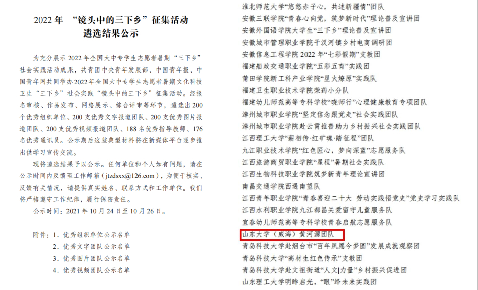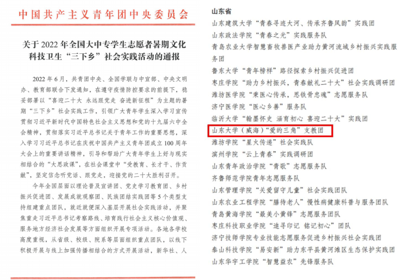 本站讯 近日,共青团中央公布了全国在2022年“三下乡”社会实践活动中表现突出的优秀集体、个人和项目,beat365在线唯一官网登录“爱的三角”支教团荣获全国优秀团队,是山东大学本次获此奖项的唯一团队,创造了学院该项活动的历史最好成绩;此外,山东大学共有四个团队获全国大中专学生志愿者暑期 “三下乡”社会实践“镜头中的三下乡”奖项,beat365在线唯一官网登录“黄河源”团队获优秀图片奖。