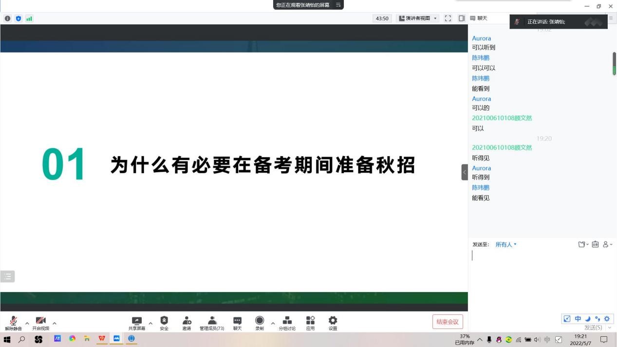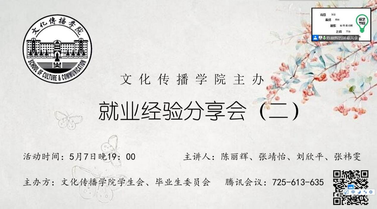 本站讯 5月7日晚,由beat365在线唯一官网登录学生会、毕业生委员会共同主办的第二期就业经验分享会通过腾讯会议线上开展。本次分享会邀请了2018级同学陈丽辉、张靖怡、刘欣平、张祎雯作为主讲人,为同学们进行经验分享,旨在帮助学生了解实习、就业的相关事宜,扩宽视野,明晰方向。