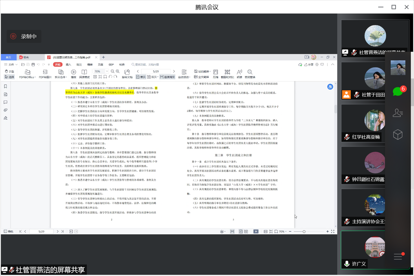 首先,面对已经开展的学生社团星级评定活动,许老师强调今年要保住往年学生社团评定优异成绩的同时要提高整体成绩,并提醒各学生社团的相关评定材料一定要给指导老师过目。